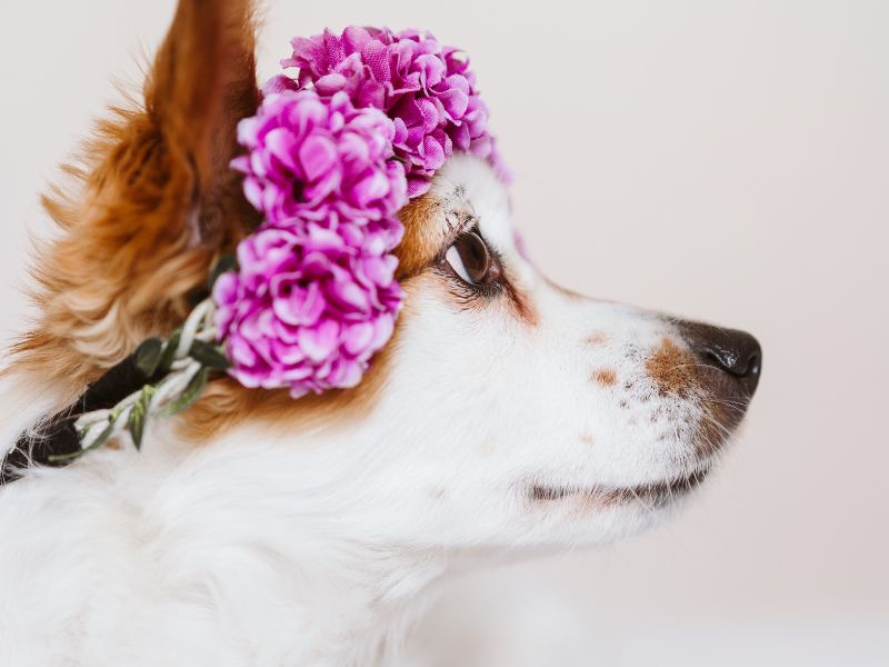 This may contain: a white dog wearing a flower collar with flowers on it's neck sitting down